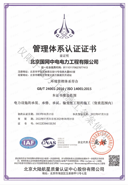 北京國網中電電力工程有限公司,已取得國家電監會頒發的《承裝(修、試)電力設施許可證》、為電力施工承裝四級、承修四級、承試四級企業。北京市住房和城鄉建設委員會頒發的房屋建筑施工總承包二級、機電設備安裝工程專業承包二級、輸變電專業承包二級、城市及道路照明工程專業承包二級、市政公用工程總承包二級資質、勞務不分等級,已通過ISO9001:2015 GB/T50430-2017質量管理體系、GB/T24001-2016/ISO 14001:2015環境管理體系、